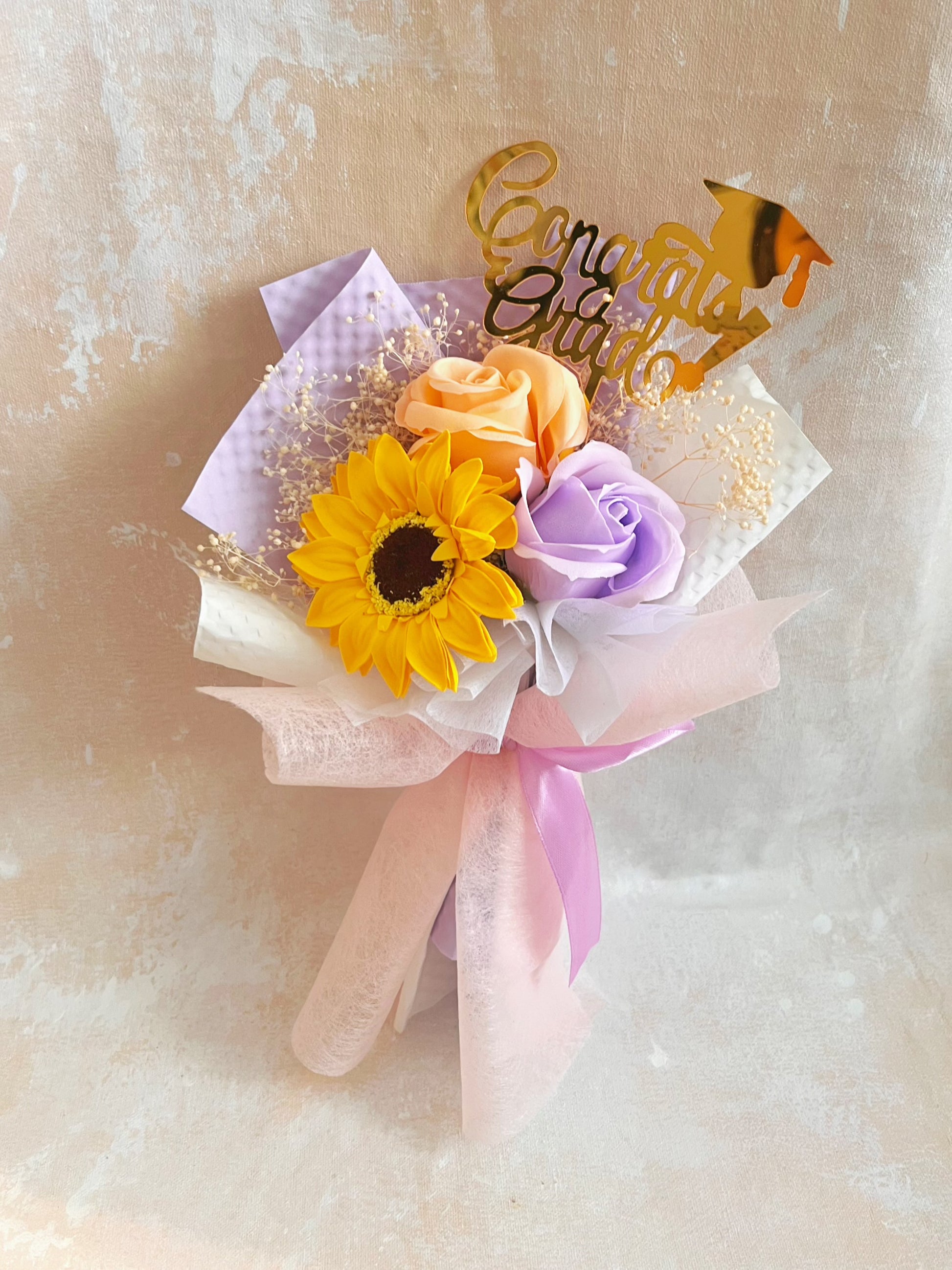 小女孩畢業禮 畢業花束精選 1枝太陽花花束 + 玫瑰花|香梘花生日花束 中學 小學 幼稚園