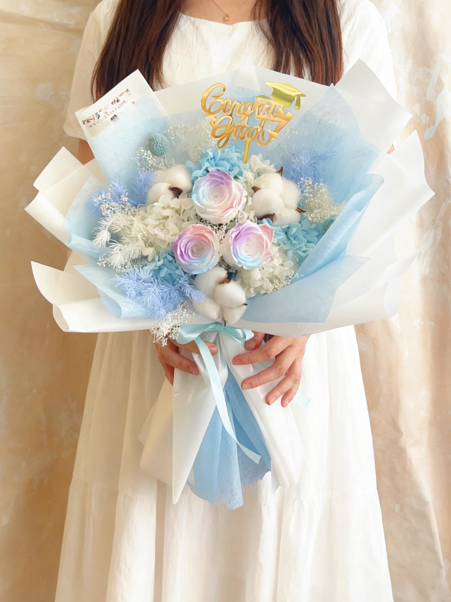 把天空的柔藍、雲朵的輕白,都揉進這束花裡